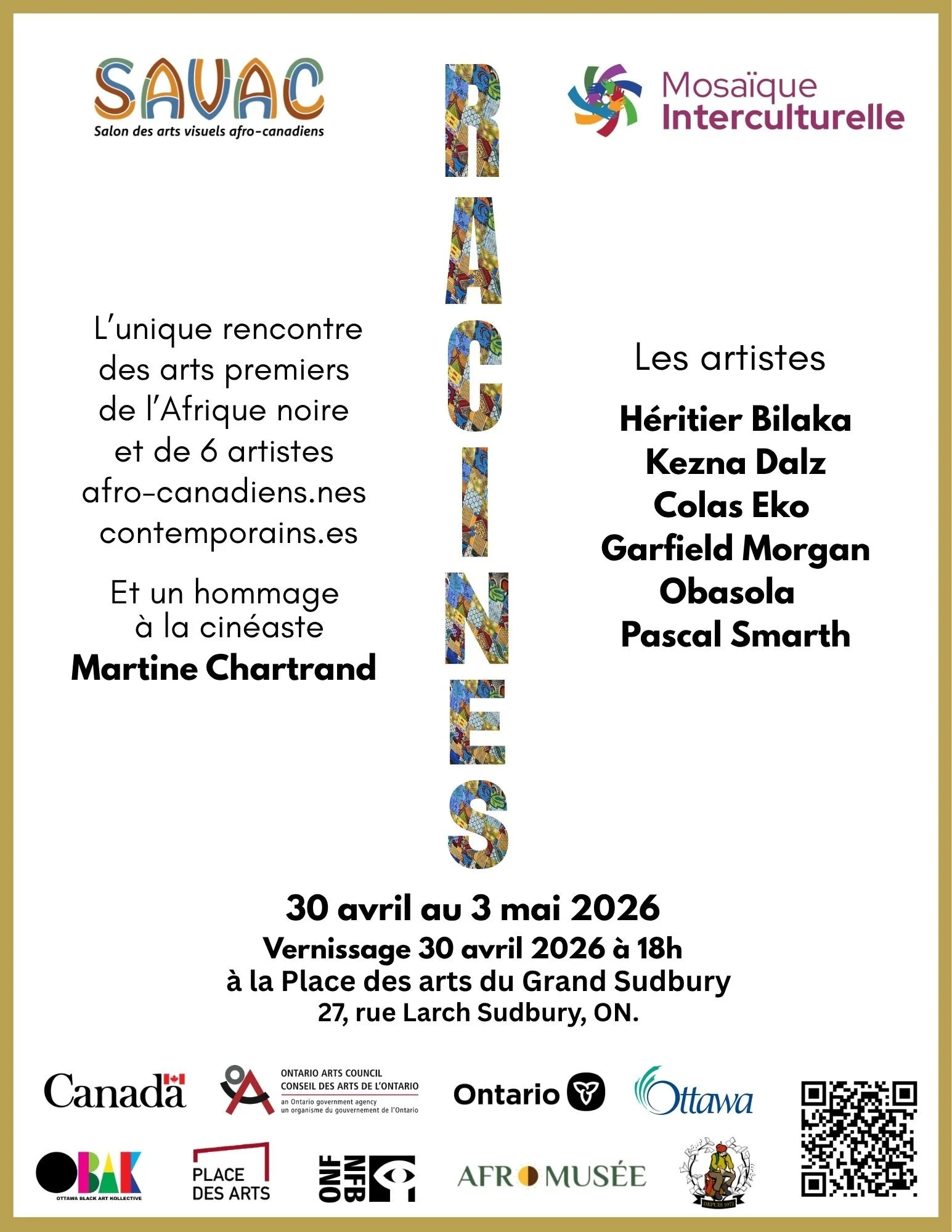 L’exposition RACINES présenté par Mosaïque Interculturelle continue à Sudbury. Cette exposition réunit une sélection d’artistes afro-canadiens contemporains issus de diverses disciplines, dont : Héritier Bilaka(Ottawa), Kezna Dalz (Montréal), Garfield Morgan (Edmonton), Obasola (Ottawa), Colas Eko (Montréal) et Pascal Smarth (Montréal). Leurs pratiques variées, peinture, photographie, installations et collages multimédias illustrent la richesse et la diversité des expressions artistiques afrodescendantes au Canada.